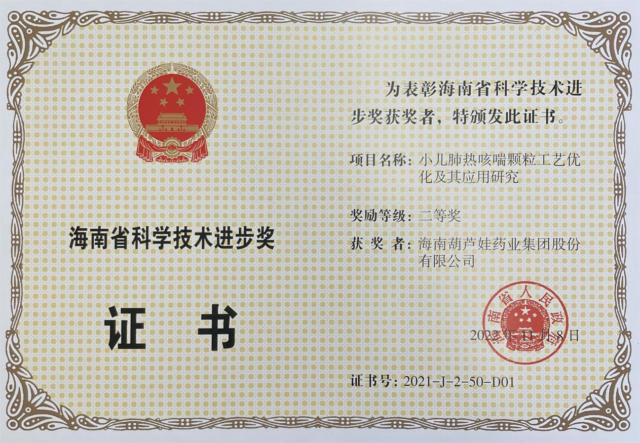 为此,小儿肺热咳喘颗粒的制备方法获得了第二十一届中国专利优秀奖(2019年),专利申请号:ZL201010134951,此次作为专利技术的应用,获得了2021年度海南省科学技术进步奖二等奖。在此之前,DB真人牌小儿肺热咳喘颗粒还多次被授予“临床价值中成药品牌”、“中国连锁药店最具合作价值单品”,荣登“中国医药品牌榜”。